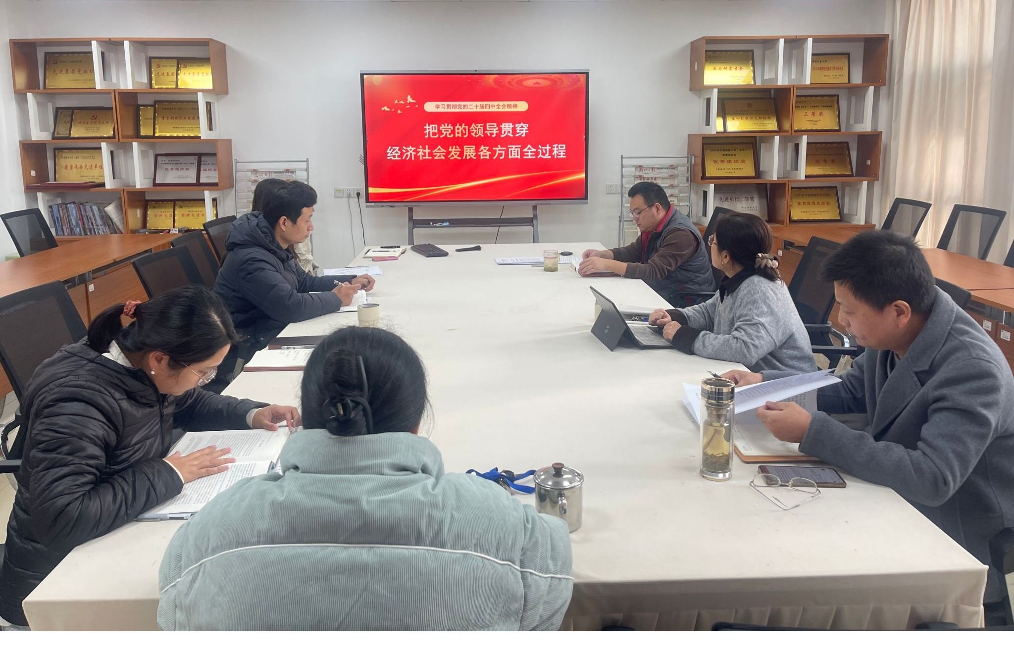 为深入学习贯彻党的二十届四中全会精神,切实把思想和行动统一到党中央决策部署及学校工作要求上来,11月20日,教育研究院召开党总支理论学习中心组(扩大)学习会,专题学习党的二十届四中全会精神。院党总支理论学习中心组成员、教工党支部书记、系主任、全体办公室人员参加学习。院党总支副书记兼副院长陈彪同志领学并主持会议。